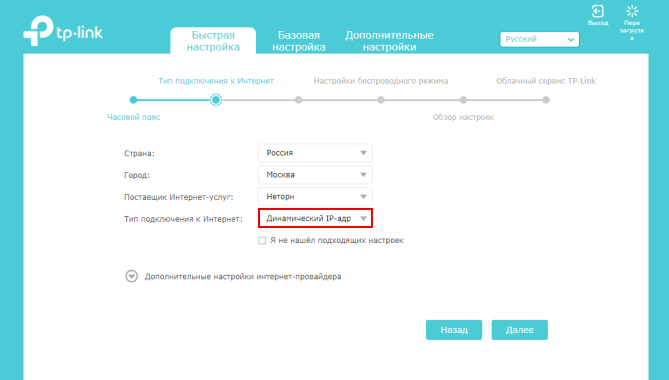 Самый главный пункт на этом экране - “Тип подключения к интернет”. В разных роутерах этот вариант может называться - “Автоматический IP”, “DHCP-клиент” или как в данном примере “Динамический IP-адрес”